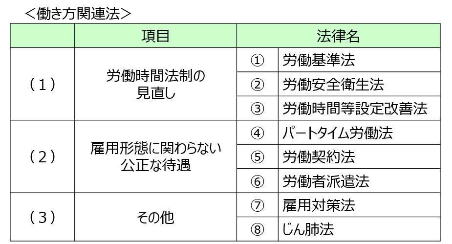 働き方改革関連法という言葉をよく聞きますが、そのような名前の法律はなく、今回の多様な働き方を選択できる社会を実現するために改正された法令の総称を働き方改革関連法と呼んでいます。具体的には、(1)労働時間法制の見直しによって労働基準法、労働安全衛生法、労働時間等設定改善法、(2)雇用形態に関わらない公正な待遇によってパートタイム労働法、労働契約法、労働者派遣法が改正されそれに付随して雇用対策法、じん肺法も改正されています。つまり働き方改革関連法というのはこれらの8つの法律およびそれに関連する施行令や通達等をあわせた法令を総称しての呼び方になります。