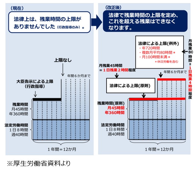 主な内容としては、①時間外労働の上限が年間720時間までに規制、②月60時間を超える時間外労働割増率の引上げ(25%⇒50%)、③年5日の有給休暇取得義務付け、④同一労働・同一賃金などが罰則付きで施行されています。特に①の時間外労働の上限は原則年間360時間、例外で年間720時間となっています。