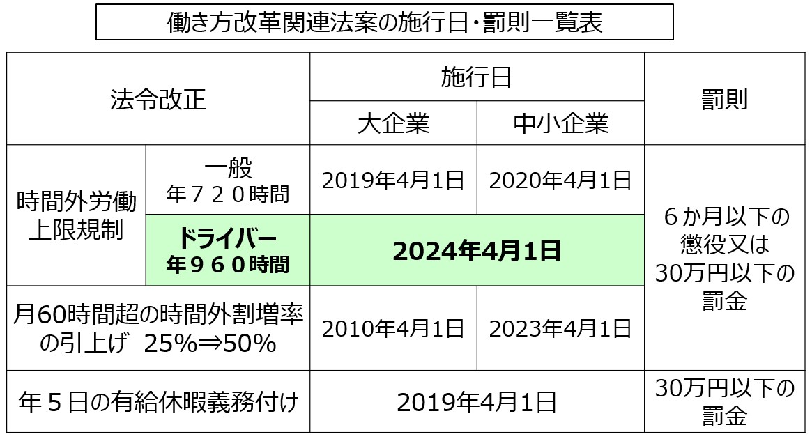 時間外労働の上限は原則年間360時間、例外で年間720時間となっており大企業では2019年4月から、中小企業でも1年遅れで2020年4月から適用されており違反した場合は、6か月以下の懲役又は30万円以下の罰金が科せられます。2019年段階での時間外労働上限年間720時間を守ることができない業種として、①自動車運転の業務(トラック、バス、タクシー)、②建設業、③医師、④沖縄県及び鹿児島県の砂糖製造業に関しては罰則付きの規制を改正法施行5年後の2024年4月からに、上限規制を適用するとしています。また、自動車運転の業務は、時間外労働の上限規制が一般業種の年間720時間ではなく、特例業種として年間960時間が上限となっています。