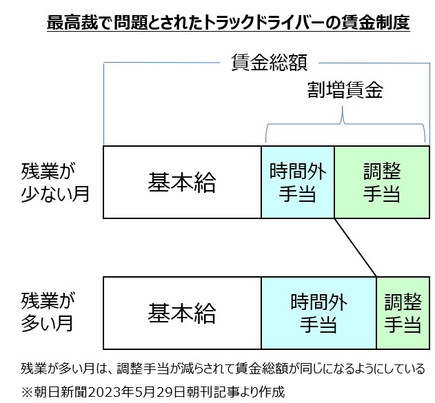 同社は2015年からトラックドライバーに対して、賃金総額を決めそこから基本給を引いた金額を割増賃金として支払う制度を導入しました。この割増賃金は時間外手当と調整手当にわけられます。賃金総額が決められた一定の金額のため時間外手当が増えると調整手当が減り、長時間労働をしても賃金総額が変わらない仕組みになっていました。
