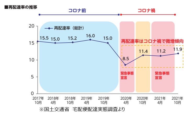 国土交通省が年2回実施している宅配便再配達率のサンプル調査では、2019年4月には全体の16%(都市部では18%)ありましたが、宅配ボックスや街中の宅配ロッカー設置が普及したため、2021年4月の再配達率は11.2%(都市部で12%)と改善されています。総合物流施策大綱に示された再配達率7.5%にするためにはさらなる努力が必要になってきます。