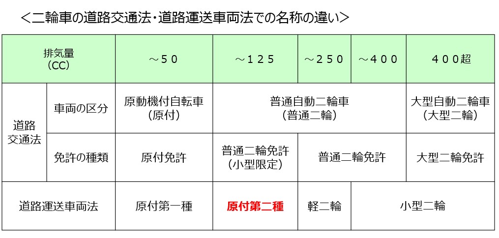 この普通二輪免許には、51CCから125CCまでの小型限定免許と126CCから400CCまで運転することができる限定条件なしの普通二輪免許に分かれています。要するに自動車の普通免許だけではなく、別途、教習所に通って普通二輪免許を取得しなければ運転することができません。1種原付、2種原付という区分は運転免許に関係する道路交通法ではなく、道路運送車両法で規定されている形態になります。道路運送車両法は、車検や保管基準、自動車登録などの取り決めを行う法律で道路交通法とは別建ての法律体系となります。この道路運送車両法で、50CC以下の二輪車を1種原付、51CCから125CCまでの二輪車を125CC原付と2種原付(正式には原付第2種)となります。これが、原付2種と呼ばれている二輪車の車種(51CC以上125CC以下)になります。従って、2種原付というのは、道路運送車両法での用語でありこの51CC以上125CC以下の二輪車を運転するためには、普通二輪免許もしくは、普通二輪免許の小型限定を「取得していなければなりません。自動車運転免許試験場で飛び込み試験を受けられる方は別にして大多数の方は、教習所に通って、普通二輪免許を取得しないと、2種原付と呼ばれる51CC以上の二輪車を運転することができないのが現状です。