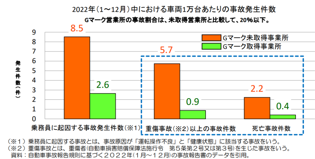 | 1 | 事故発生件数の減少 | 国土交通省の統計によるとGマーク認定を受けた事業所は、受けていない事業所に比べて事故が2022年度は20%以下になっています。Gマーク認定を受けるためには、運転者への安全教育の実施など安全性向上への取り組みが必須である、運送事業者、ドライバーともに安全への意識が高まるため事故減少につながっています。 | |