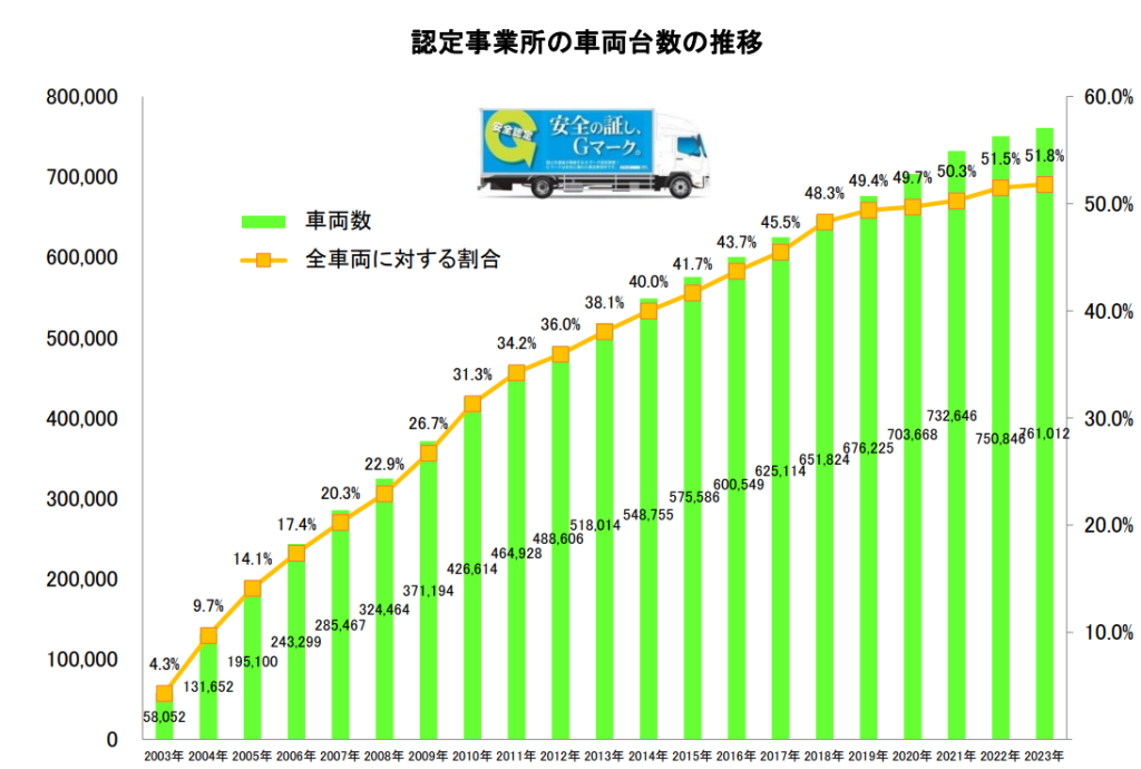 Gマーク制度は2003年(平成15年)に始まり、2023年(令和5年)で21年が経過しました。2003年から継続してGマークを取得している事業者が6回目の更新を行いその事業者の1,052事業所については、20年もの長きにわたり安全運行の実績を積み上げられたことから、長期認定事業所として、新たにデザインしたゴールドGマークステッカーを使用することができるようになりました。