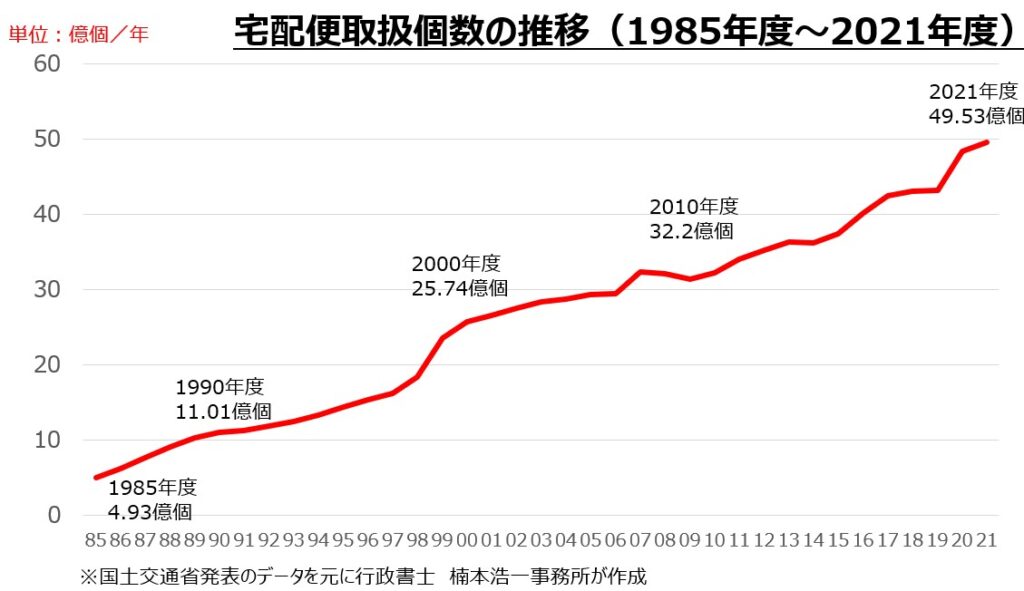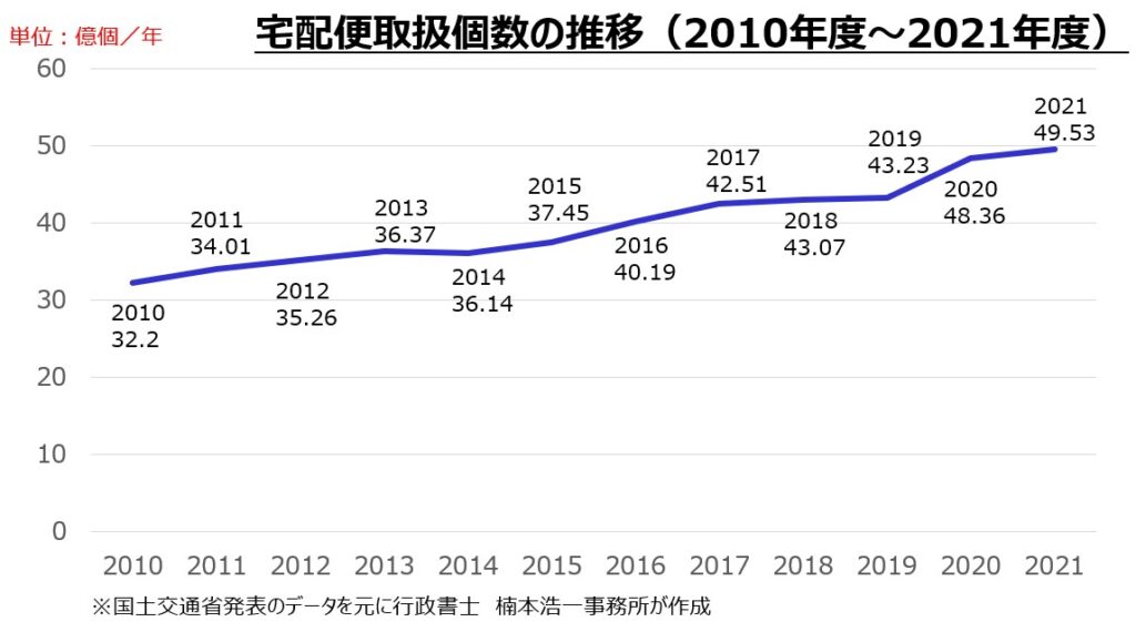 国土交通省のデータを元に筆者がグラフ化した資料ですが、2021年度は49.53億個と10年前の2011年の34.01億個に比べて146%の伸びになっています。10年で貨物量が1.5倍になった計算です。