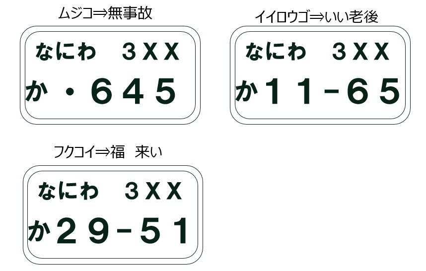 抽選制の1ケタ数字やゾロ目番号でなくても縁起のよい数字の組み合わせが人気で無抽選ながらも毎回のように希望者がでている番号もあります。645=ムジコ(無事故)1165=イイロウゴ(いい老後)2951=フクコイ(福来い)などです。これらの番号は縁起がよい語呂合わせの数字として、わざわざ小切手でつくってきて初詣のお賽銭に入れる人もいるようです。