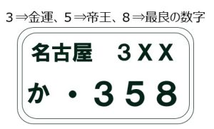 名古屋ナンバーだけ、縁起がいいナンバーとして358番の人気が高く抽選制になっています。その理由は、風水では3=金運、5=帝王、8=最良の数字といわれており、その数字をあらわした358が人気の理由になっています。また、お釈迦様が悟りを開いたのが35歳8か月であるというのも縁起がいい数字の由来になっており、この数字を自動車のナバープレートにしたいと考える人が多いようです。