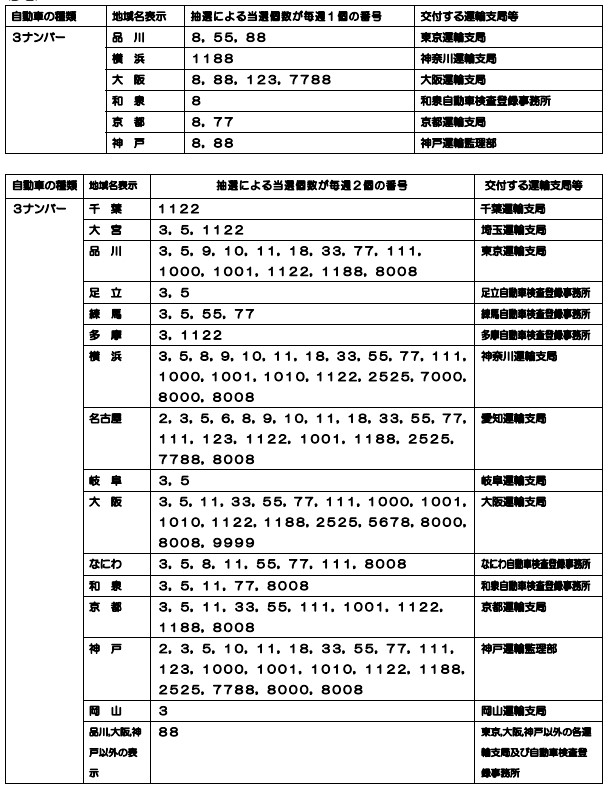 末広がりを表す・・・8の番号は、人気が高く、多くの自動車登録事務所で払い出しが制限されています。通常、毎週4枚の番号が当選しますが、品川、大阪、和泉、京都、神戸は・・・8が毎週1個しか当選しないようになっています。同じ人数の希望者がいても他の番号は毎週4個当選しますが、これらの番号は毎週1個しか当選しないため倍率がかなり高くなってしまっています。品川ナンバーの場合、・・・3、・・・5等の数字も毎週2個しか当選しなくなっており高倍率です。