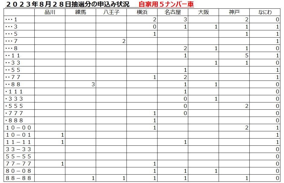 2023年8月28日抽選分の希望ナンバー申込状況を下記の表にまとめました。・・・1は、まだどこの運輸支局も払い出し制限がかかっておらず毎週4個当選するため希望者を多くいます。また、払い出し制限がかかっている・・・8も多くの方が希望番号の申込をされています。希望ナンバーの抽選申込は1人1ナンバーのみですが、落選した場合でも引き続き申し込むことができるため、当選するまで気長に申込みを続けるかたもいらっしゃいます。