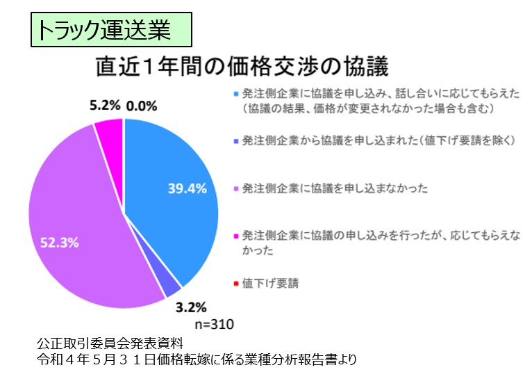 価格転嫁の協議状況では、発注側企業に価格転嫁の協議を申し込まなかったが52.3%、協議の申し込みを行ったが応じでもらえなかったが5.2%ありました。