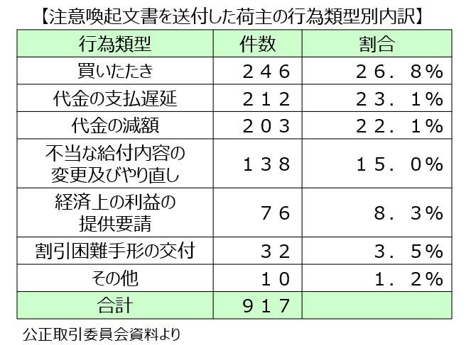 また、立入検査まではいかないが物流特殊指定上、問題につながるおそれがある事案については、777社の荷主に対してのべ917件の注意喚起文書を送付しています。それらの事案件数を項目別でみると①買いたたき、②代金の支払遅延、③代金の減額の順になっています。