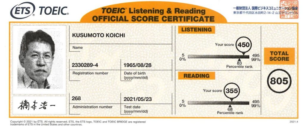 2021年5月に受けたTOEICでも800点台をキープできており英語力は海外勤務時代と比較しても衰えていません。